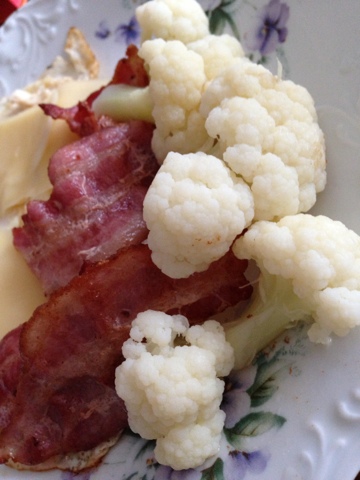 LCHF lunchen bestog av ägg, bacon och blomkål. Ska försöka göra gratänger av olika slag i veckan, så att jag får med mig